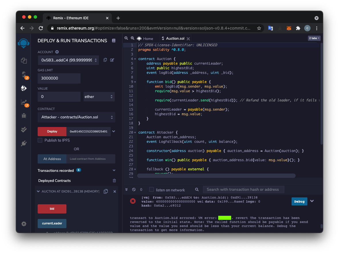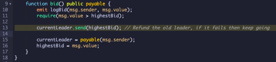 require(currentLeader.send(highestBid)); // Refund the old leader, if it fails then revert
