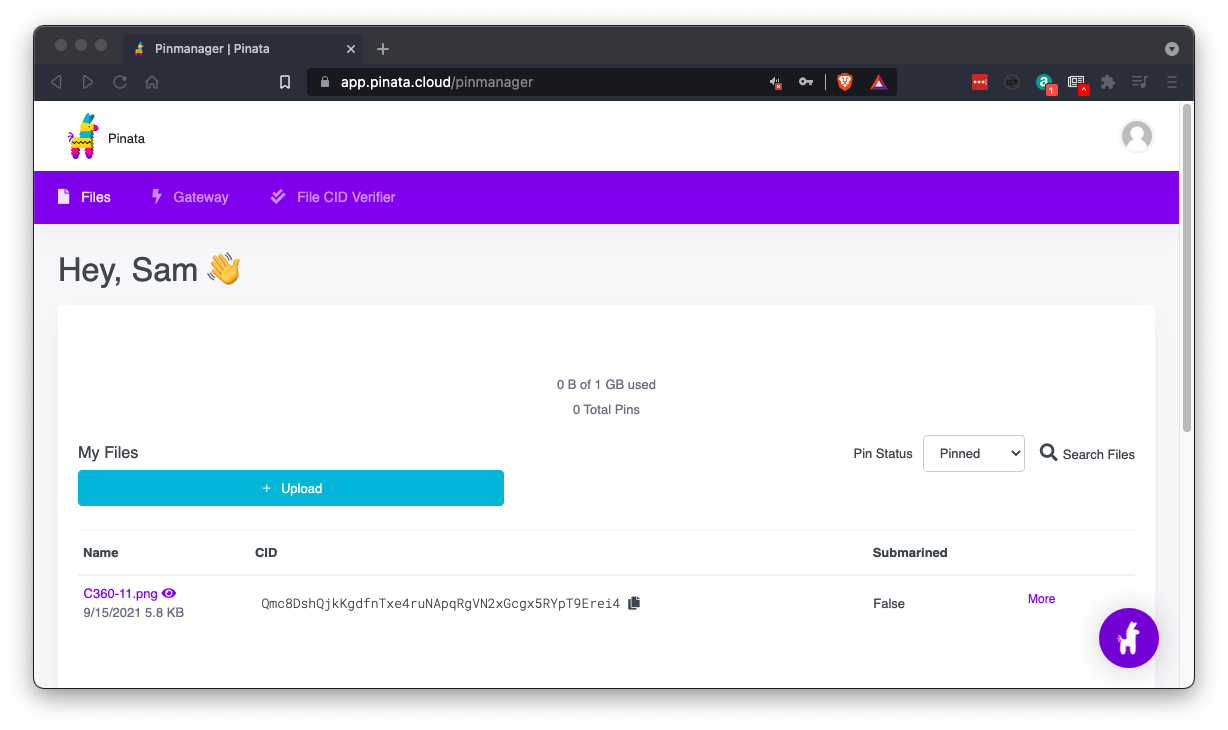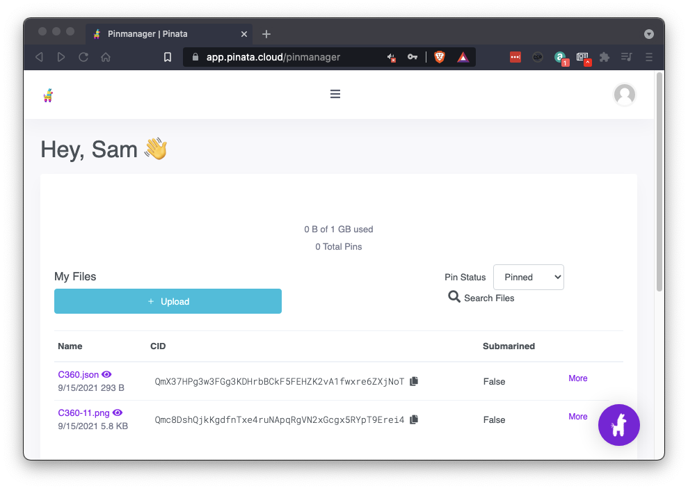 Upload the .json file to Pinata, so you have two files, as shown below.