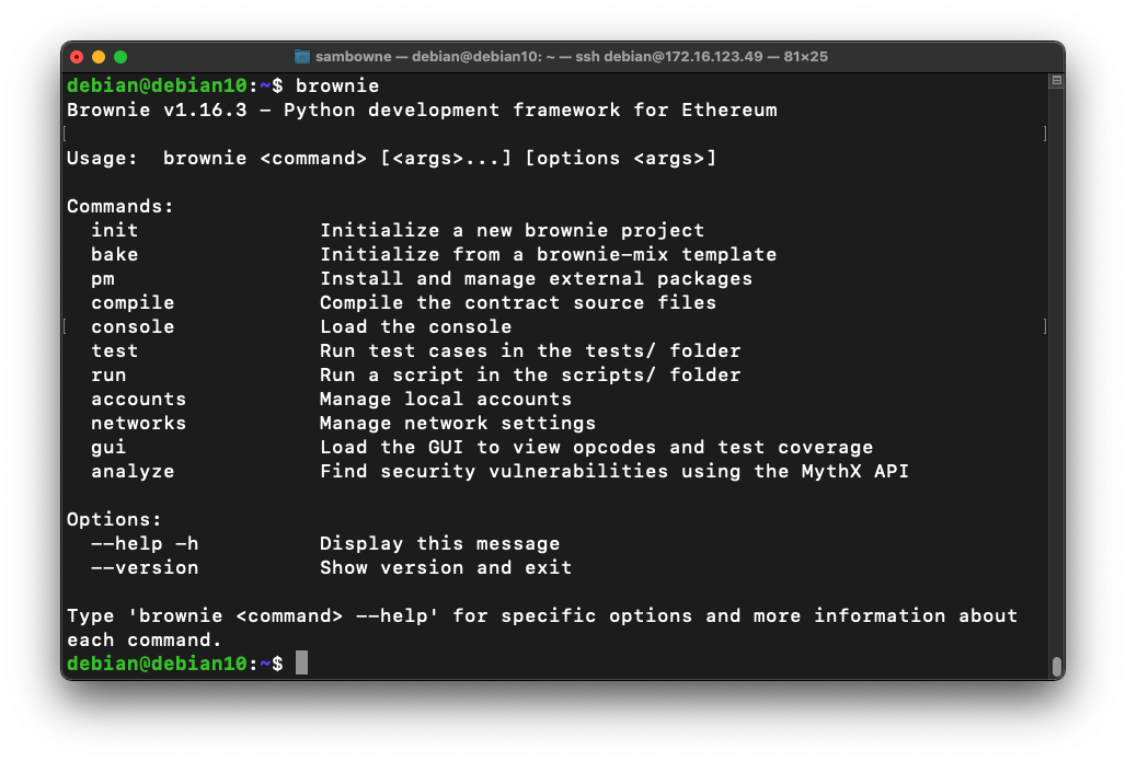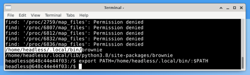 If brownie is not found, execute this command to find it. The location is highlighted in the image below.And this command to add its location to the PATH, inserting the correct location after the equals sign: