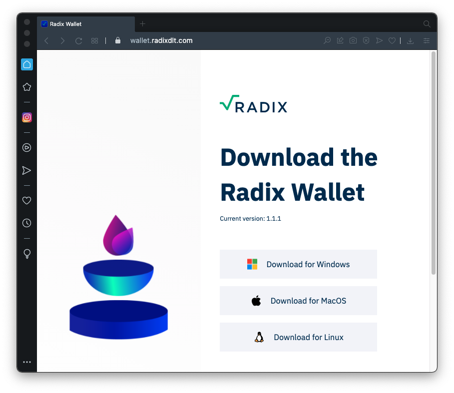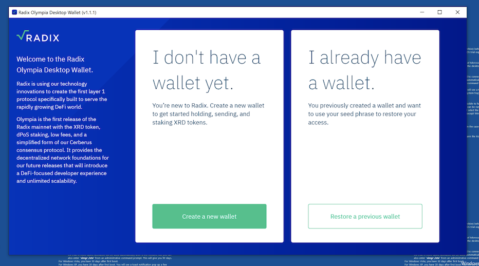 After it installs, it automatically opens, showing a "Radix Olympia Desktop Wallet" page.