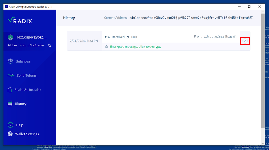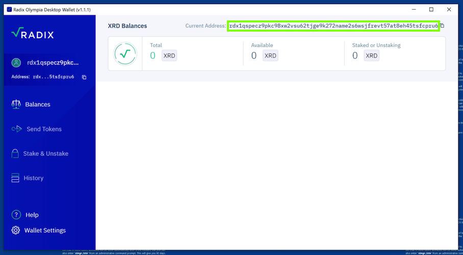 When I get your address, I'll send you some XRD. When you get it, your balance will increase.On the left side, click History.