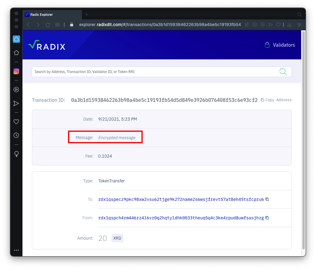Notice that the transaction information is publicly visible to everyone, but the message is encrypted and not readable, outlined in red in the image below.