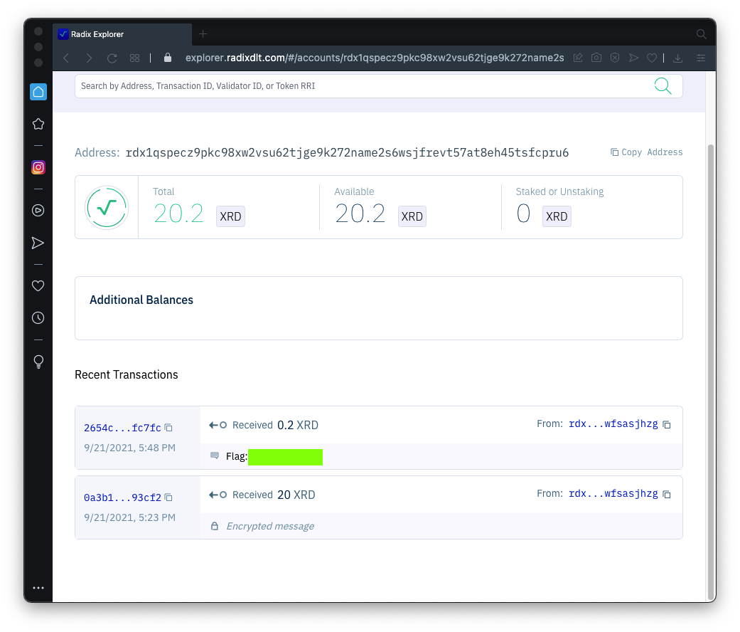 In the Radix blockchain explorer, search for transactions to this address.rdx1qspecz9pkc98xw2vsu62tjge9k272name2s6wsjfrevt57at8eh45tsfcpru6