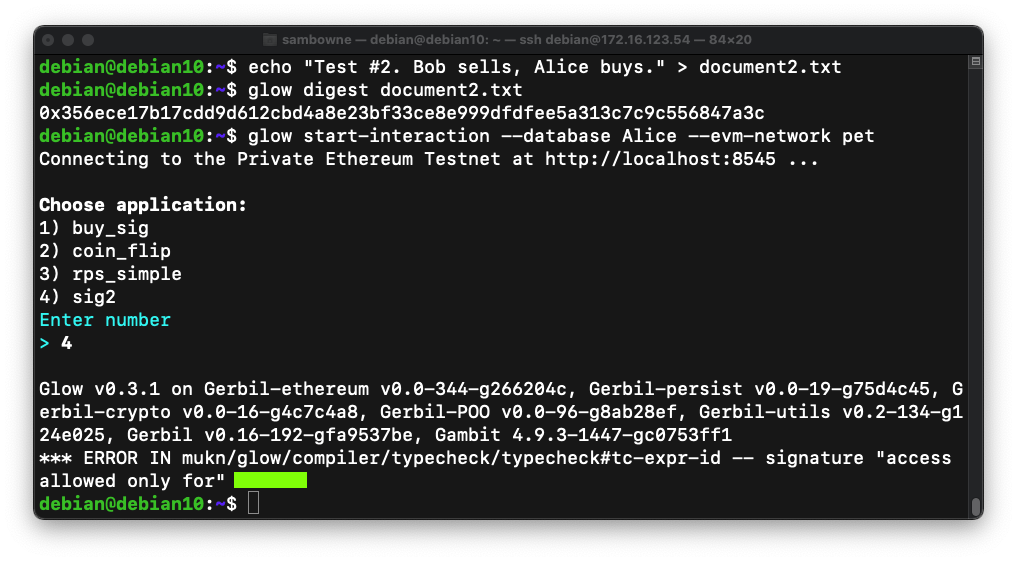 echo "Test #2. Bob sells, Alice buys." > document2.txt glow digest document2.txt glow start-interaction --database Alice --evm-network petAn error message appears.