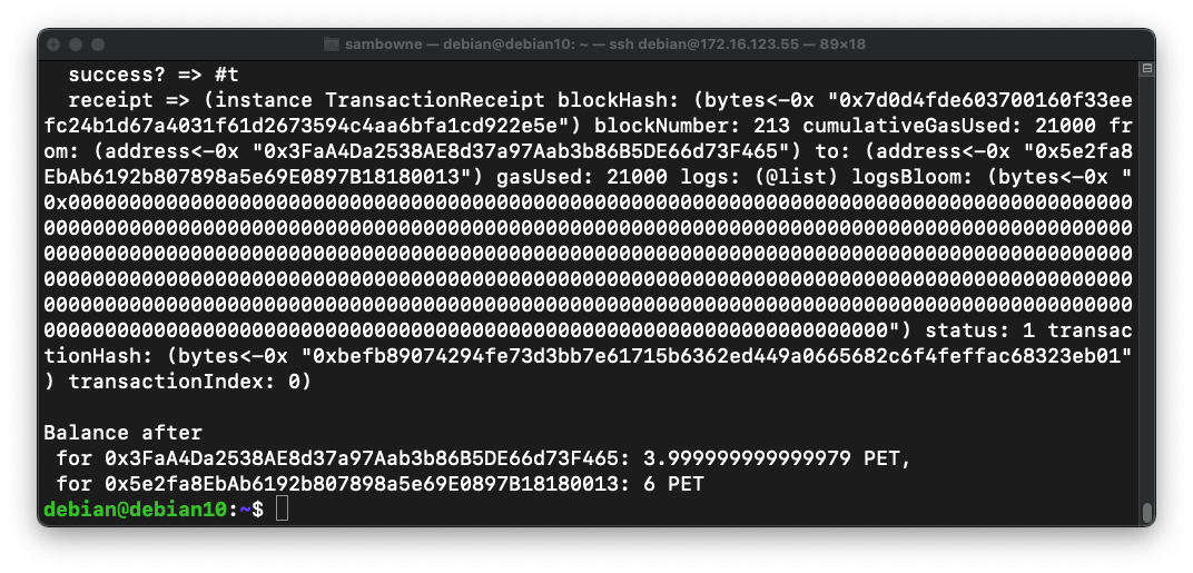 After the transfer, one account has 4 PET and the other