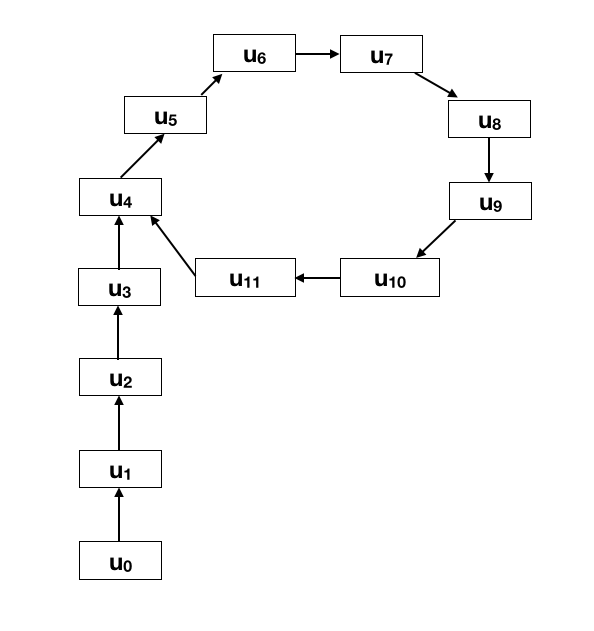 u1 = F (u0) v1 = F (F (v0))The idea is that they both race down the track shown in the figure above, with one moving faster than the other. When they hit the loop, the tortoise will catch up to the hare and the two values will be equal.