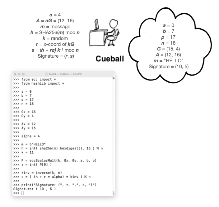 Megan wants to sign the same message, "HELLO". As shown in the image above, her private and public keys are:Use a k of 7, and the same curve as in the figure above.β = 7 B = (10, 2)Calculate Megan's signature. That's the flag.