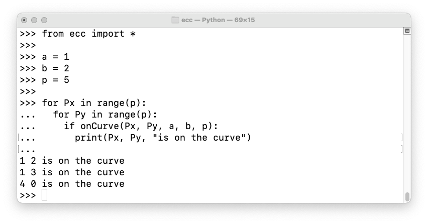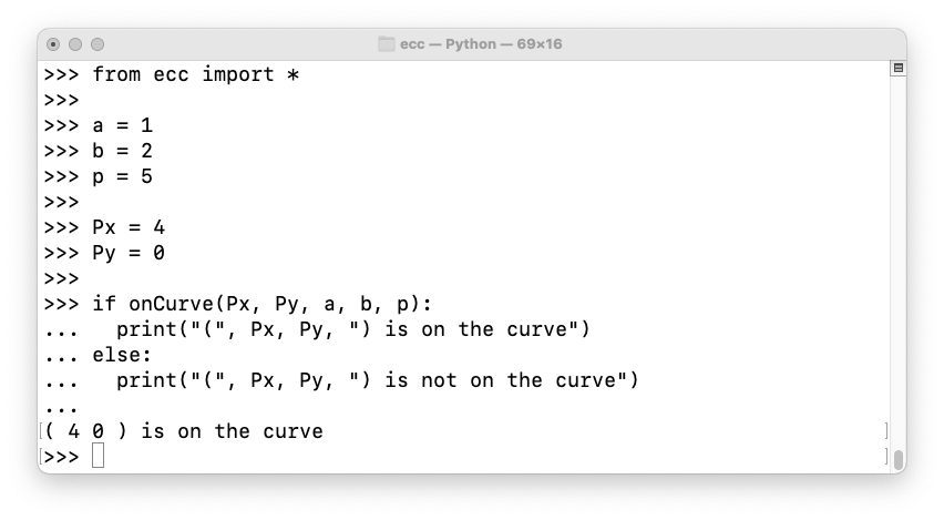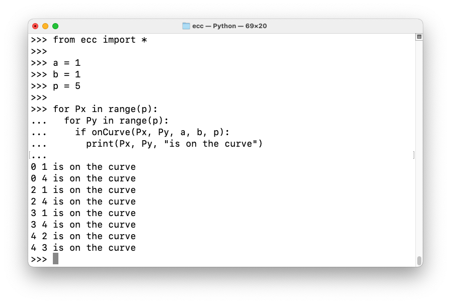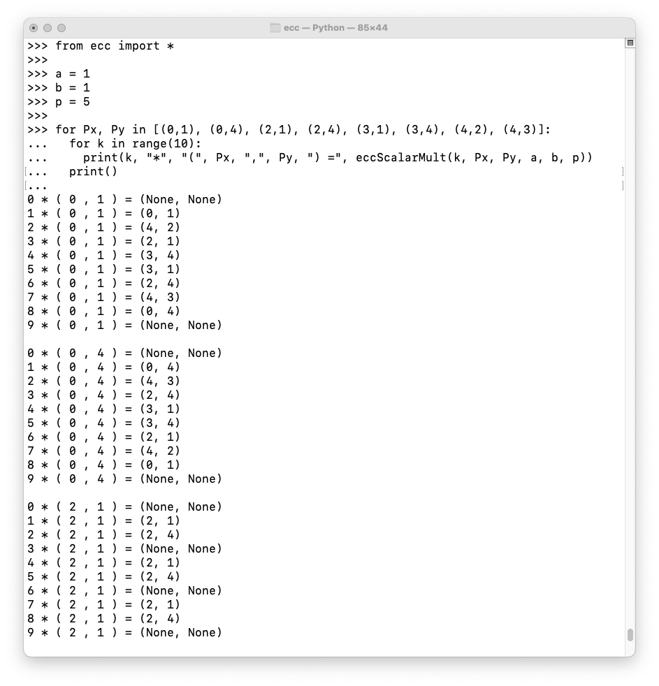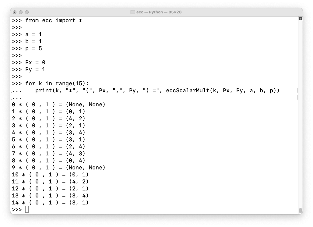print(k, "*", "(", Px, ",", Py, ") =", eccScalarMult(k, Px, Py, a, b, p))