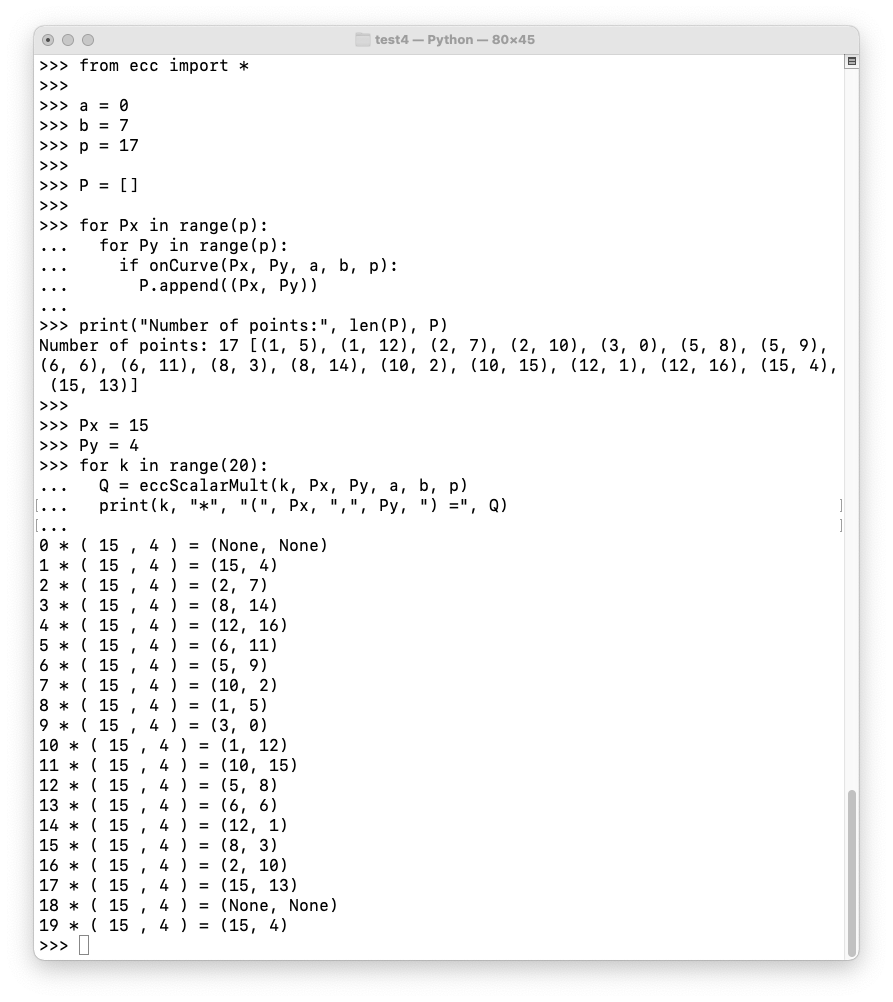 Execute the code below to confirm that there are 17 points on this curve (not including the point at infinity), and that (15, 4) is a generator.