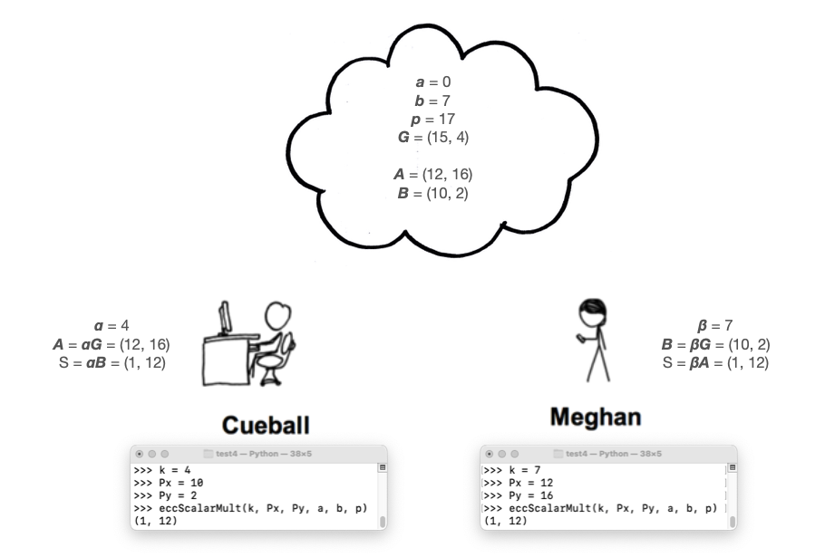 As shown below, they agree on a curve (Secp256k1), p, and a generator G. These parameters are not secret--they can be published to the public cloud.