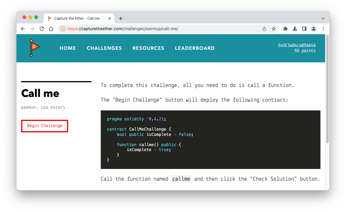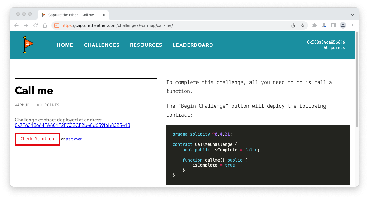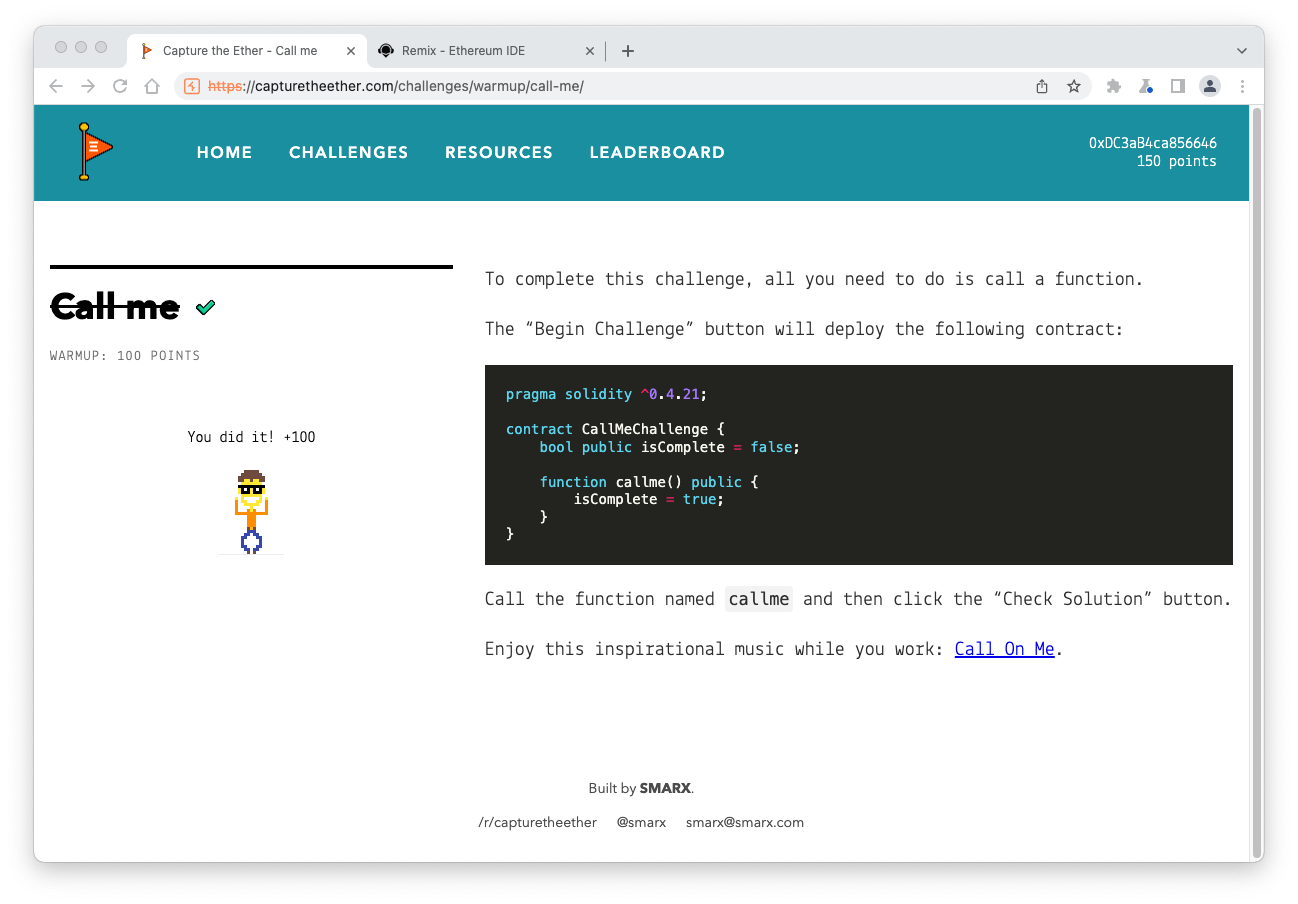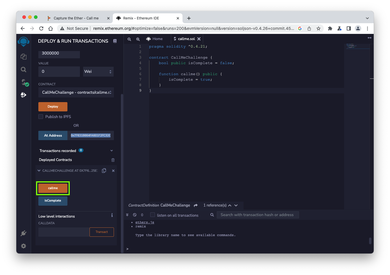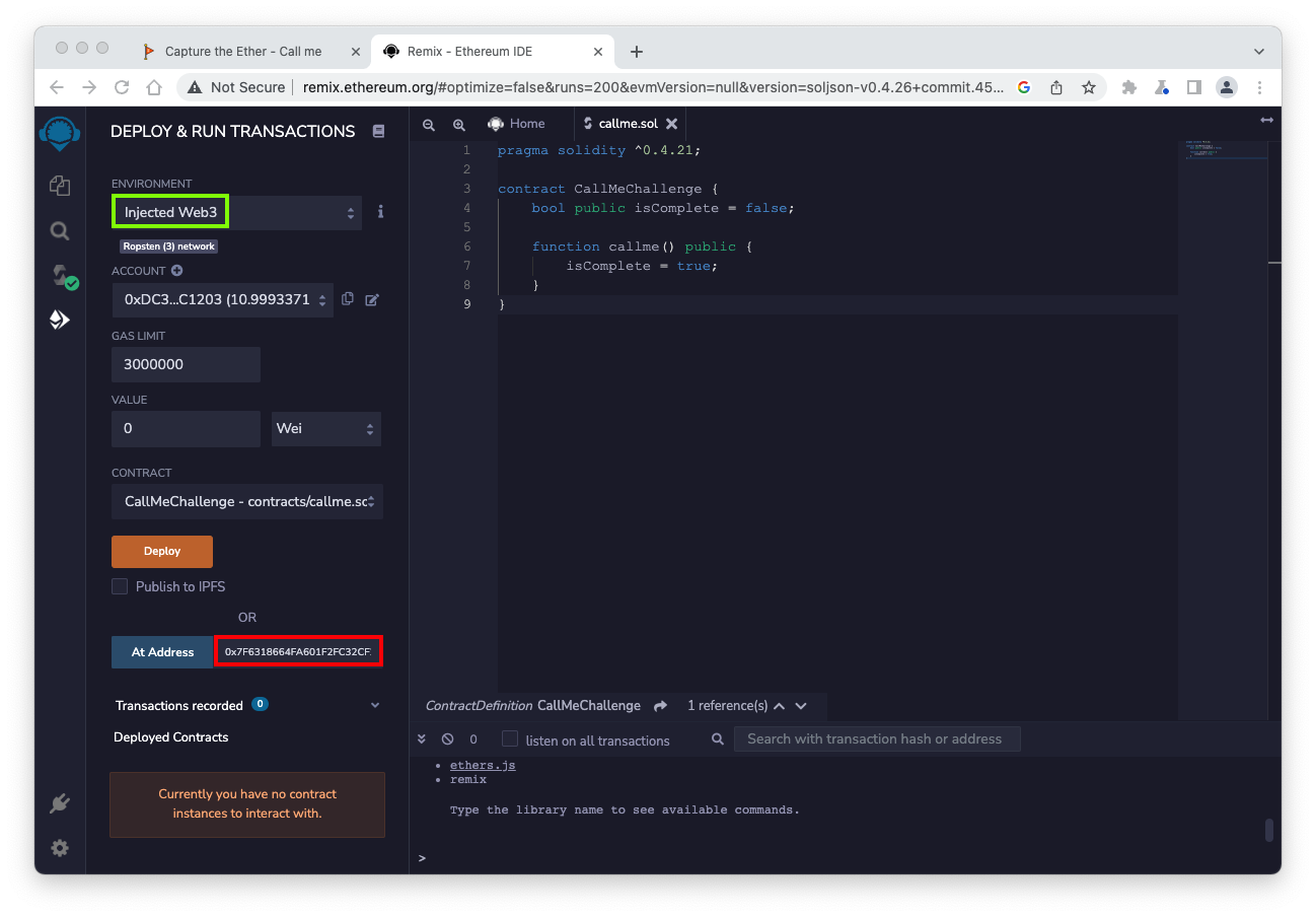 After a few seconds, the left side of the "Call Me" page shows your contract's address, as shown below.