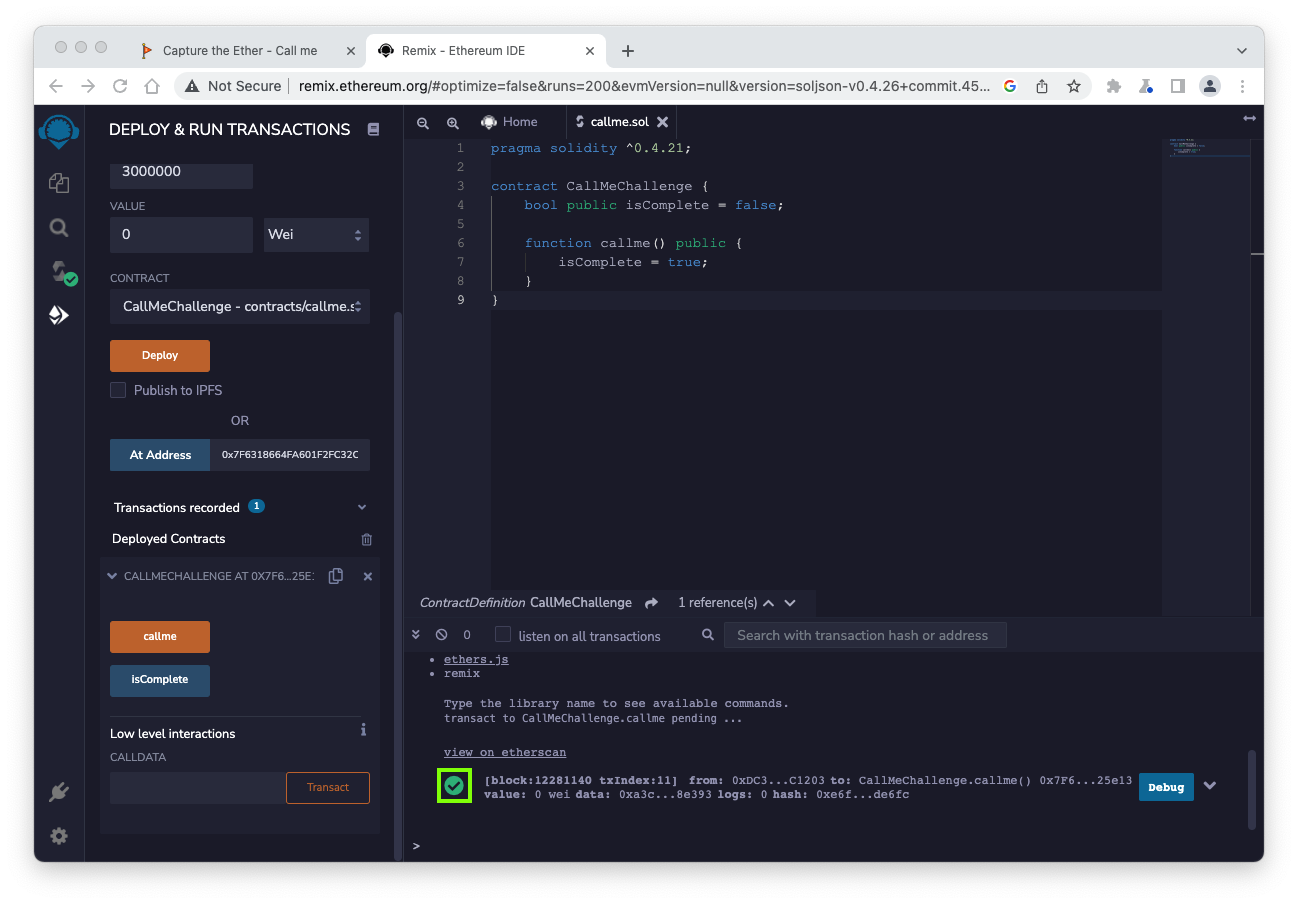 When the function call succeeds, you'll see a green check mark in the lower right pane of the Remix window, outlined in green in the image below.