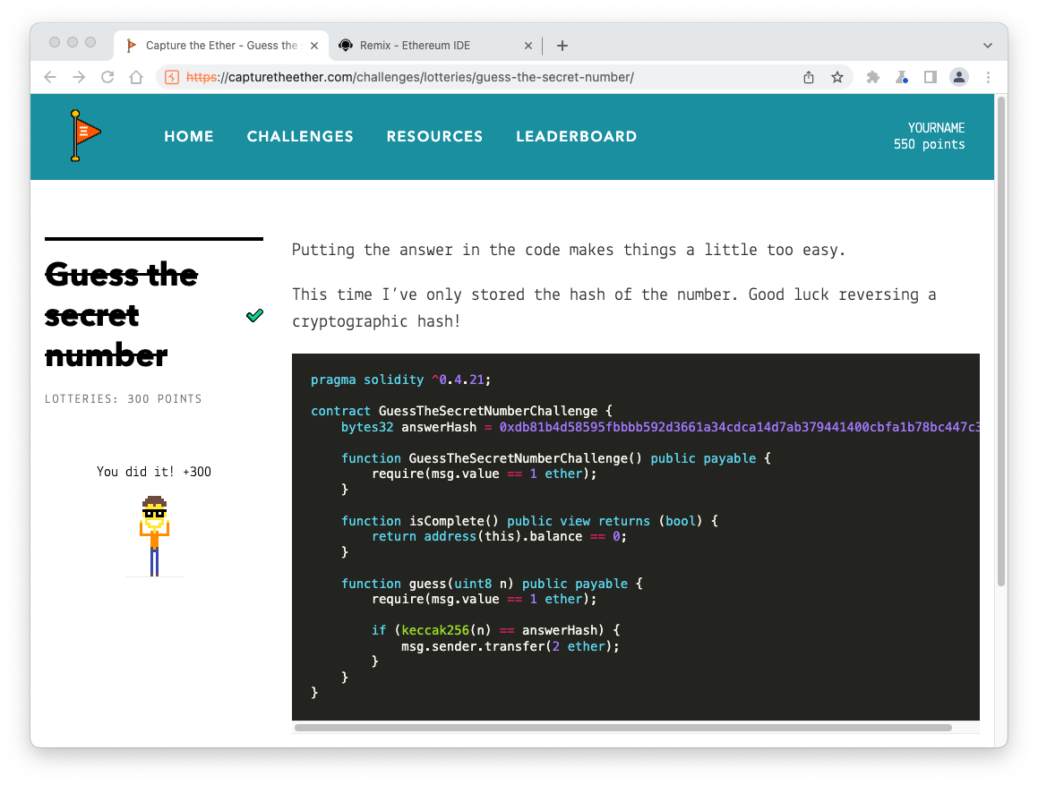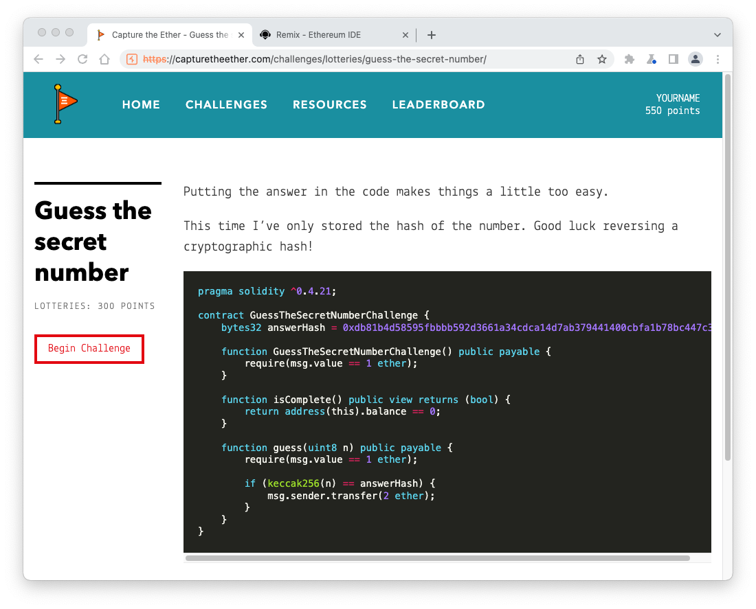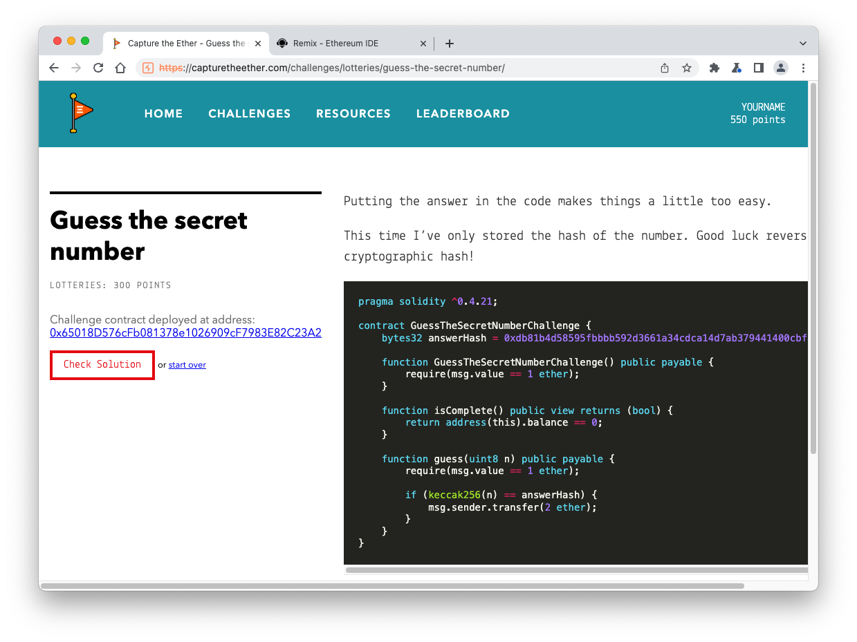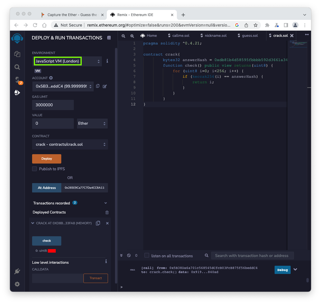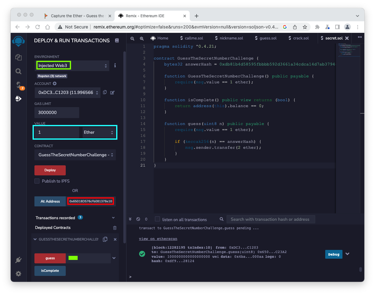 In the field next to the red guess button, enter the answer you found from your crack contract, covered by a green rectangle in the image above.