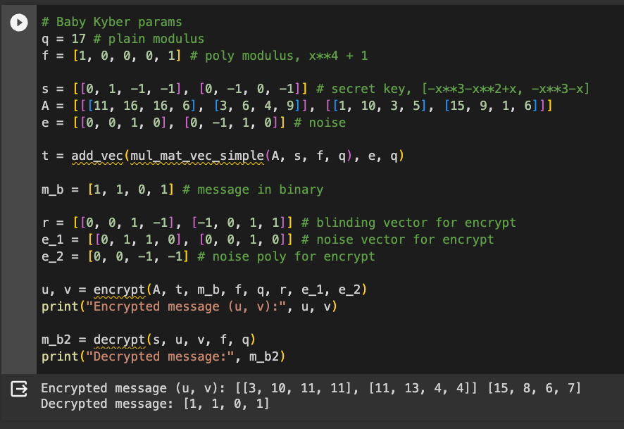 We will use a scaled-down version of Kyber called Baby Kyber, following this page: