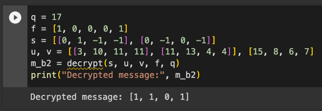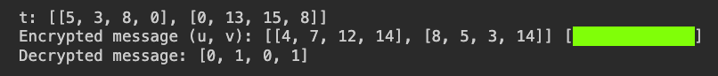 s = [[0, 1, -1, -1], [0, -1, 0, -1]] # secret key, [-x**3-x**2+x, -x**3-x]