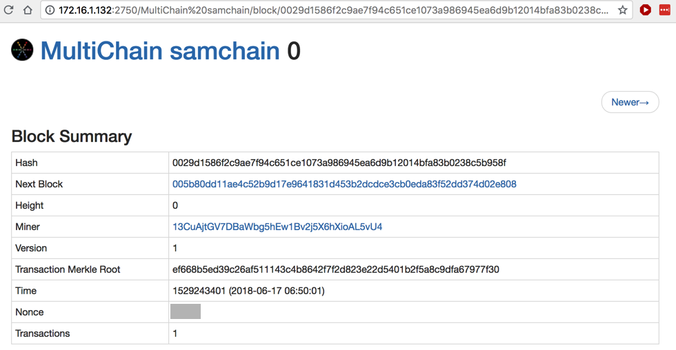 Find the Nonce value for block 0, redacted in the image below.