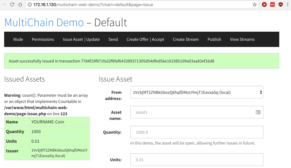 In a Web browser, enter your IP address followed by /multichain-web-demo.