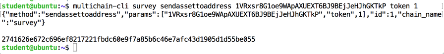 multichain-cli survey sendassettoaddress 1VRxsr8G1oe9WApAXUEXT6BJ9BEjJeHJhGKTkP token 1