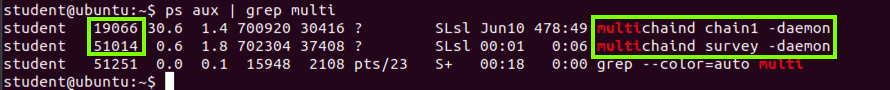 Find the process ID numbers in the second column of the multichaind processes. In the example below, there are two processes, with ID numbers 19066 and 51014.