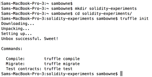 You should be able to compile the example contracts by running truffle compile. Then, to deploy the contracts to the simulated network using the testrpc node we have running, you need to run truffle migrate.