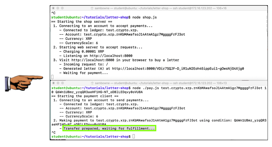 Look at your original Terminal window running the shop. It's still "Waiting for payment...", as shown below.