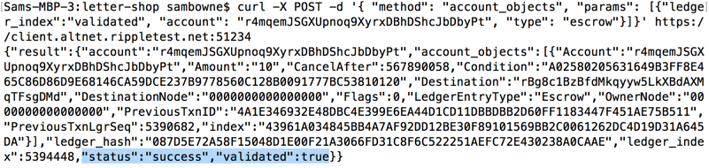 curl -X POST -d '{ "method": "account_objects", "params": [{"ledger_index":"validated", "account": "YOUR-SENDING-ADDRESS", "type": "escrow"}]}' https://client.altnet.rippletest.net:51234