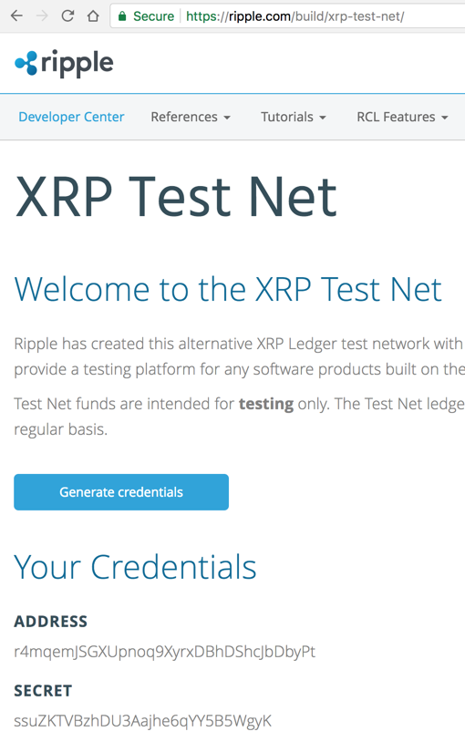 Click the "Generate credentials" button a second time. Copy your ADDRESS and SECRET values to a text file, also. These will be your CUSTOMER credentials.
