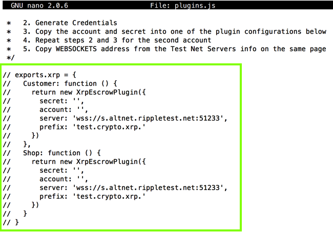 Paste in the ADDRESS and SECRET and values into the lines, for both the SHOP and CUSTOMER.
