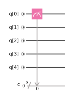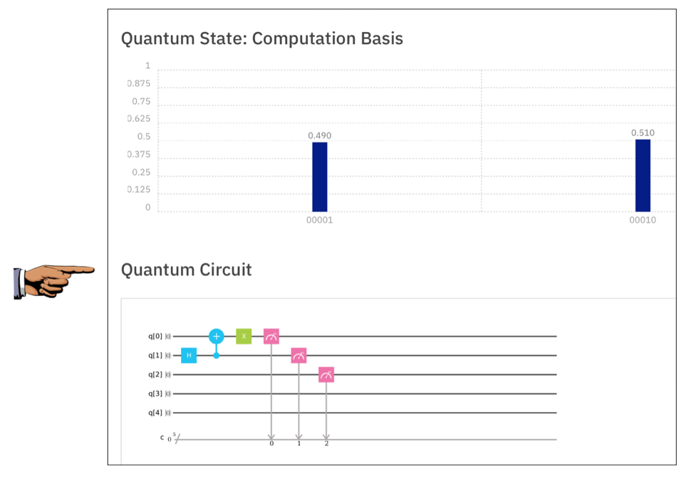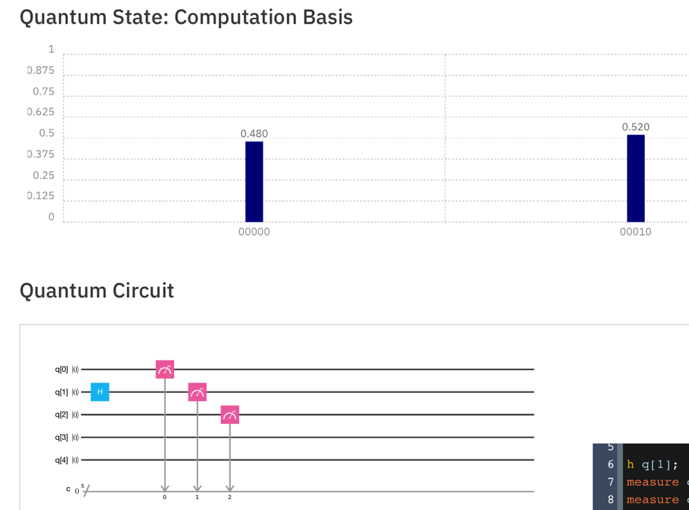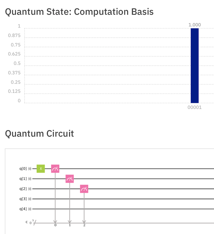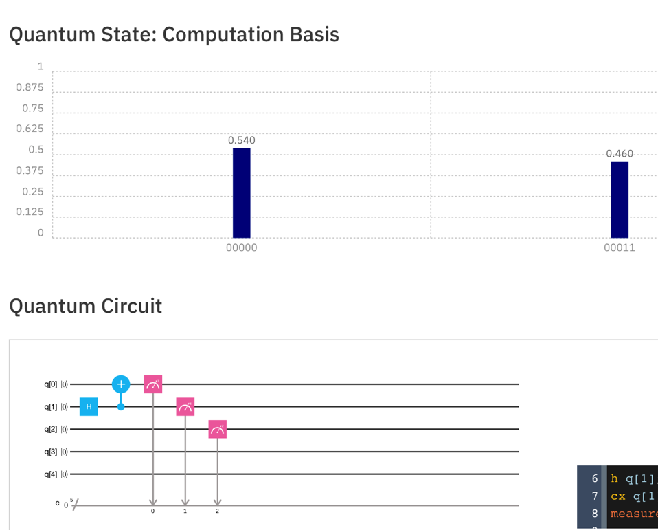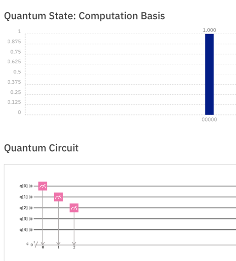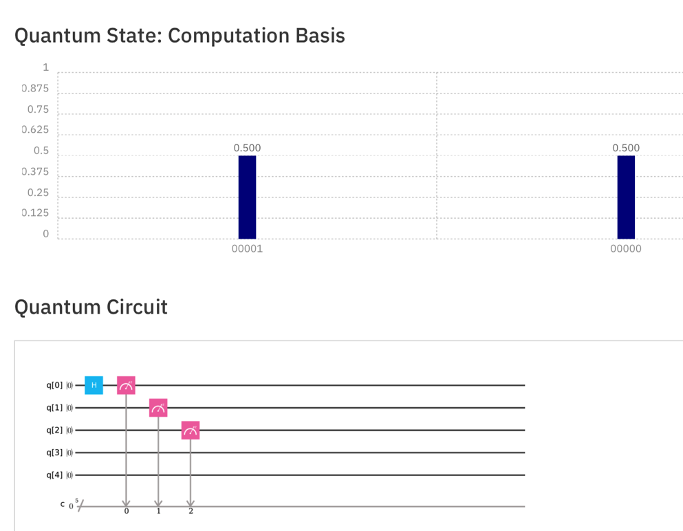 The + gate Entangles two Qubits, so they will always give the same result when measured. So Qubit 0 now follows Qubit 1, and the possible results are now 00000 and 00011, as shown below.