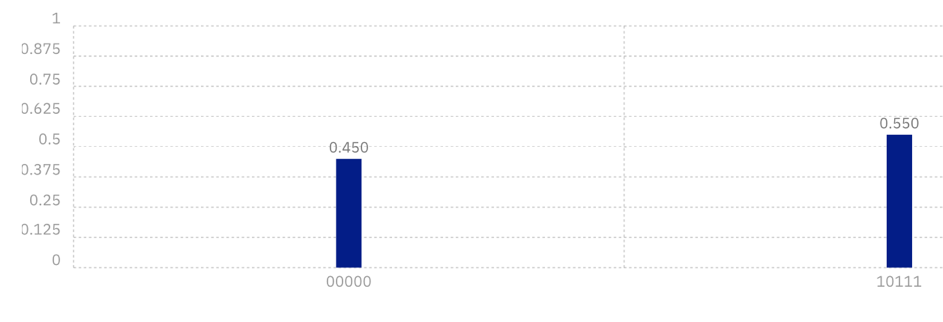 This chart shows the results of running your experiment 100 times. Every time, the result was the same: 00000, as shown at the bottom of the purple bar.
