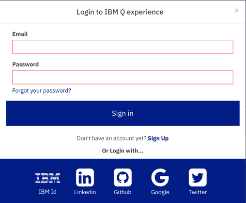 A login box pops up, as shown below. Log in with a social network, or create an IBM Q account and log in with that.
