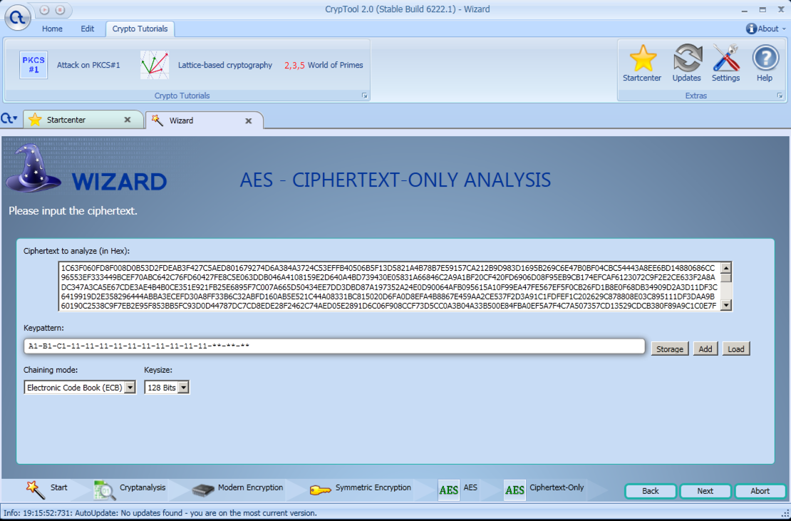 In the "AES - CIPHERTEXT-ONLY ANALYSIS" screen, some example ciphertext appears, as shown below.