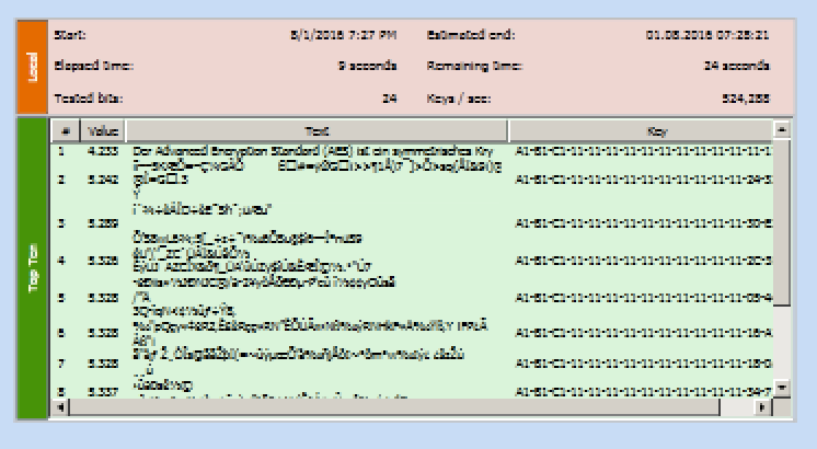 Click Next. The progress screen is very small and difficult to see, but I was able to expand it as shown below, and it is obvious how it works. It's testing about 500,000 keys per second, and the attack requires about 33 seconds, so it's testing all 16.8 million possible keys. It chooses the result with the lowest entropy, which is shown in the "Value" column. The correct cleartext has entropy 4.2, and all the others have entropy of 5.2 or larger.