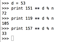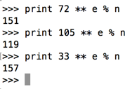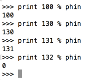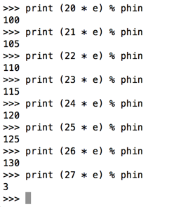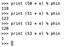 Now let's use modular arithmetic, with a modulus of phin, that is, 132. In Python, we use a % character to indicate a modulus.