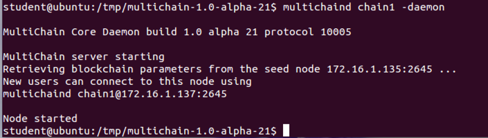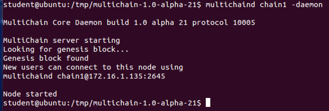You should be told that the server has started and then after a few seconds, that the genesis block was found. You should also be given the node address that others can use to connect to this chain.