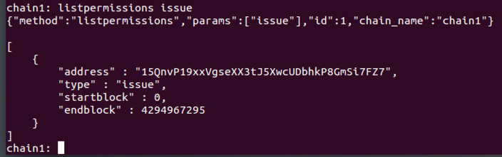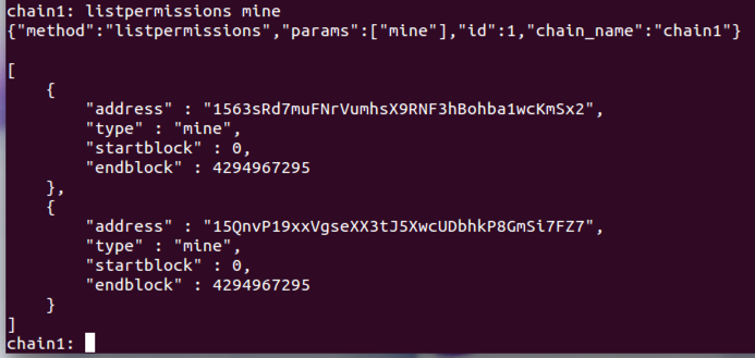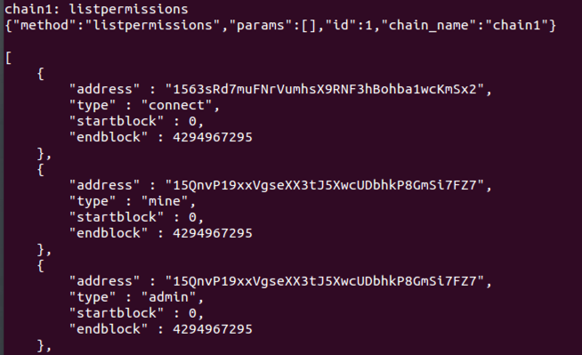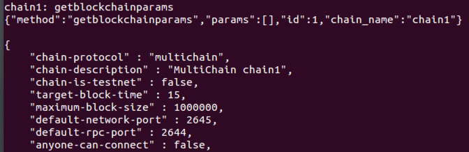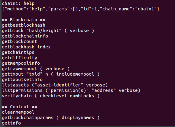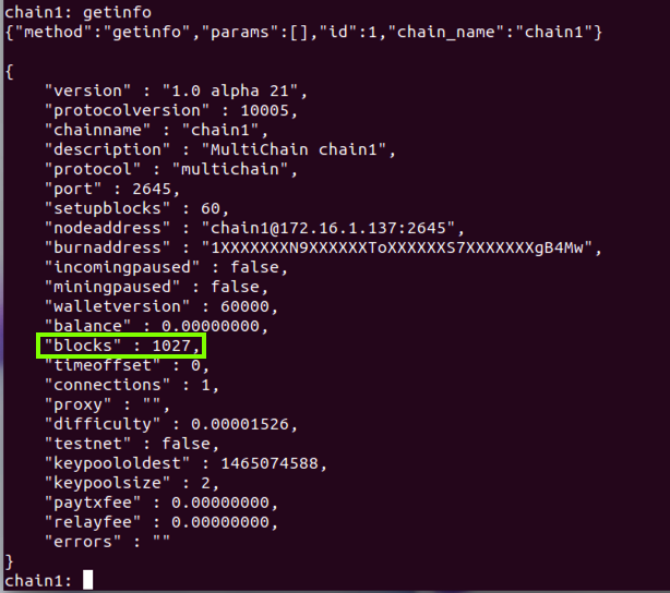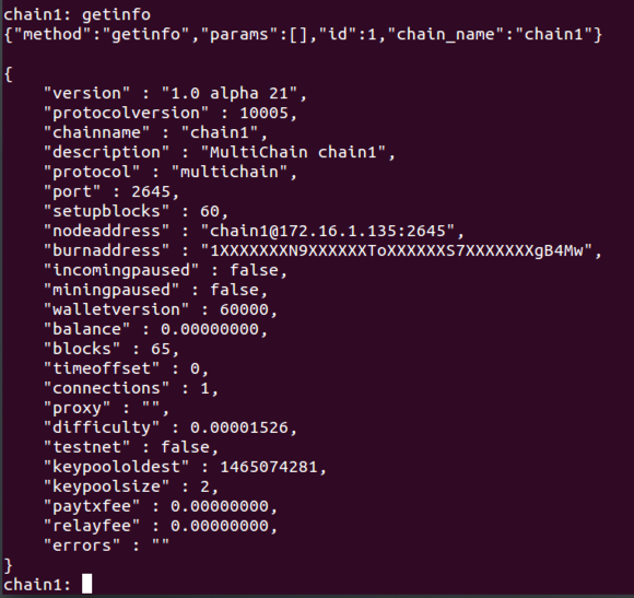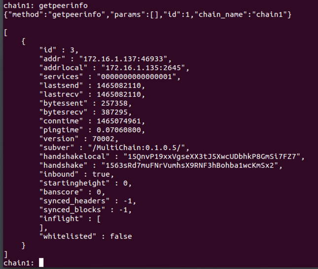 Now that the blockchain is working on two nodes, you can run the commands in this section on either or both. To get general information:
