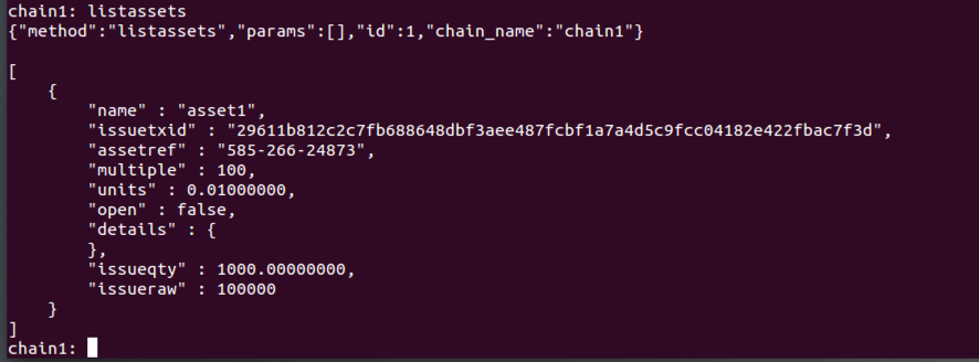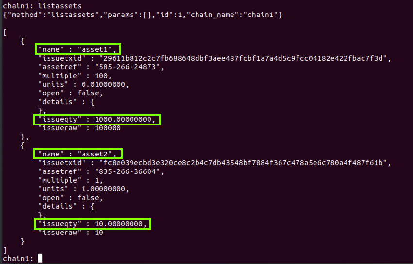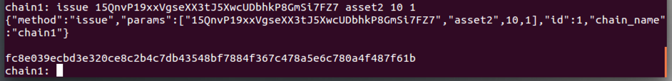 First let's create the second asset with 10 indivisible units. On your First Server, execute this command, using the address you noted in section "4. Using native assets":