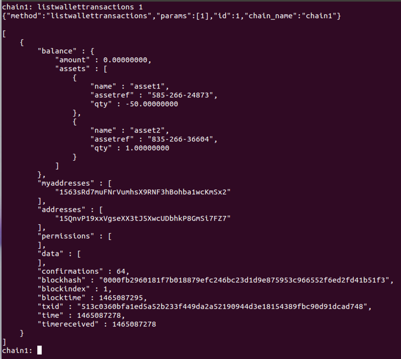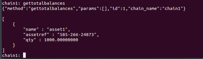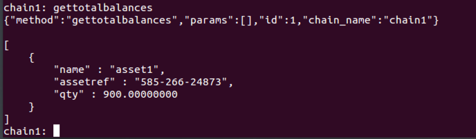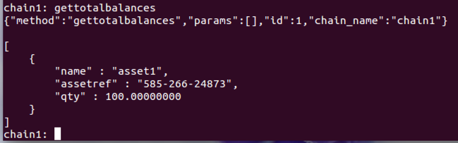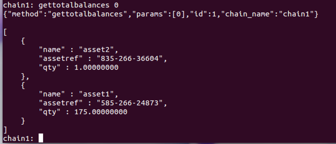 Note: the transaction that created the asset requires 30 seconds or so for confirmation.On the First Server, execute this command to check its asset balances:If you are working really fast, you may see another error at this point. If that happens, wait 30 seconds and try again.