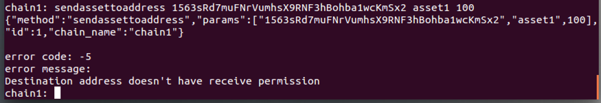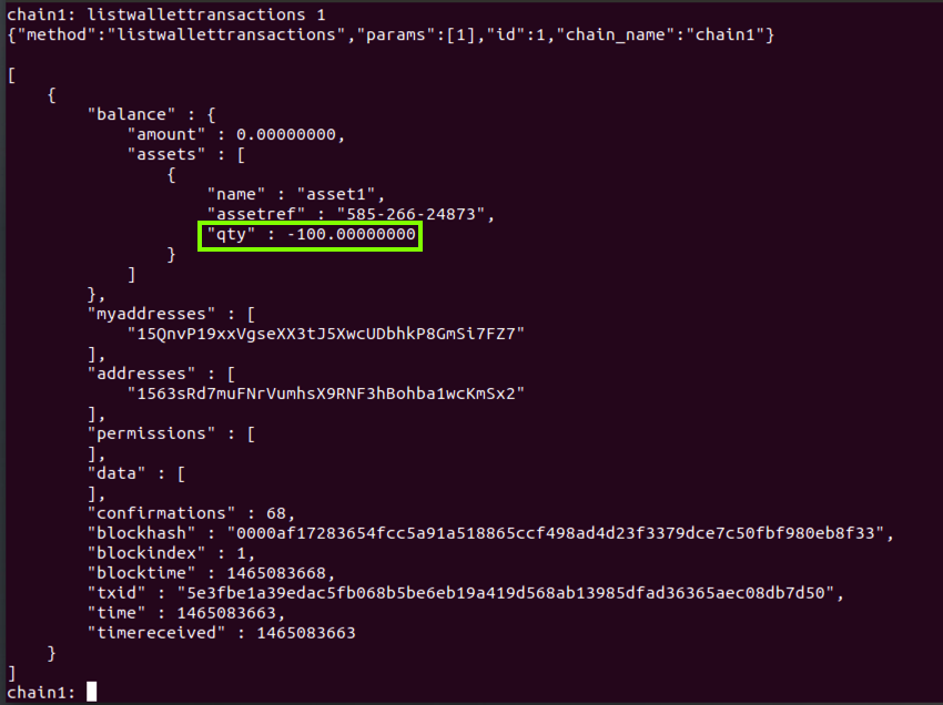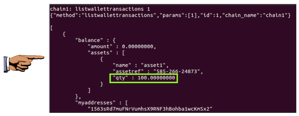 On the first server, now try sending 100 units of the asset to the second server's wallet. The address here is the address of your Second Server, which you found back in section "2. Connecting to a blockchain".