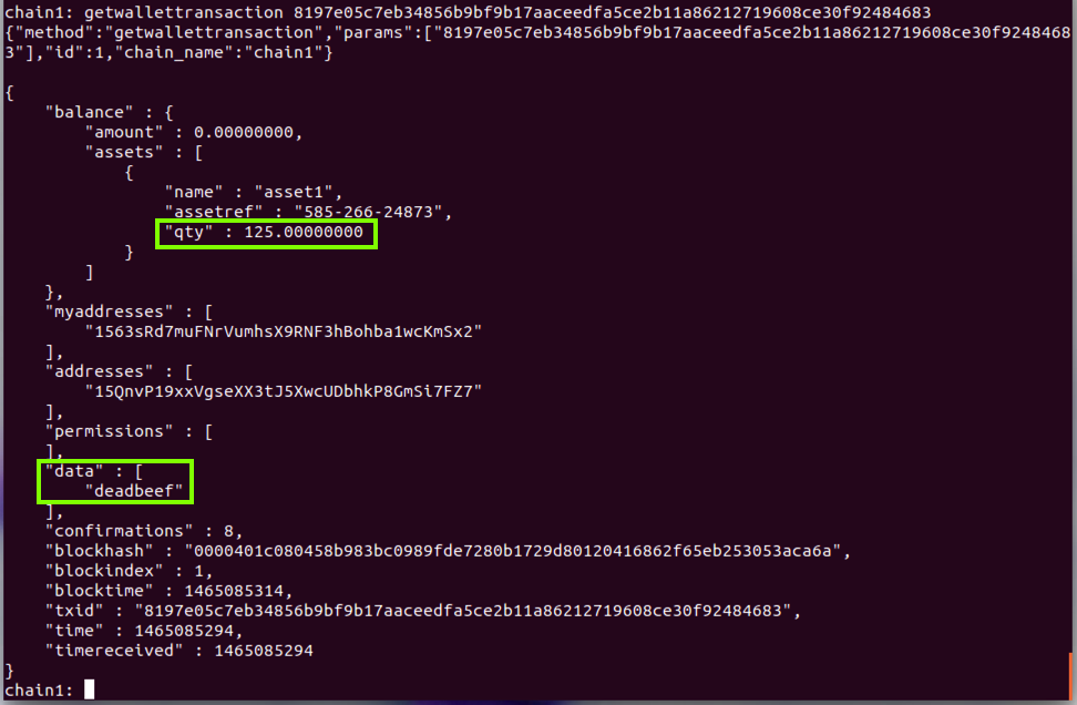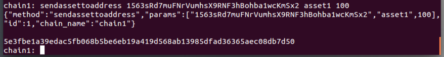 Let's send 125 units of asset1 along with metadata of "deadbeef". On your First Server, execute this command, using the address of your Second Server.