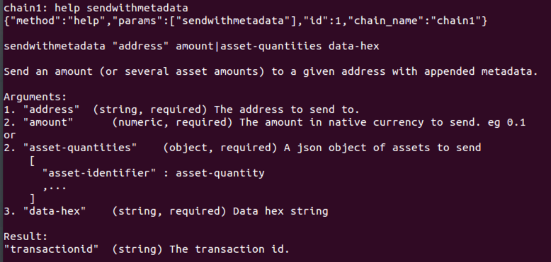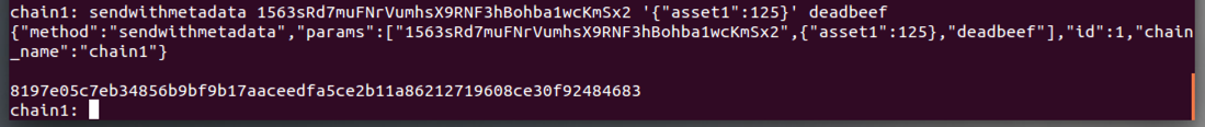 sendwithmetadata 1563sRd7muFNrVumhsX9RNF3hBohba1wcKmSx2 '{"asset1":125}' deadbeef