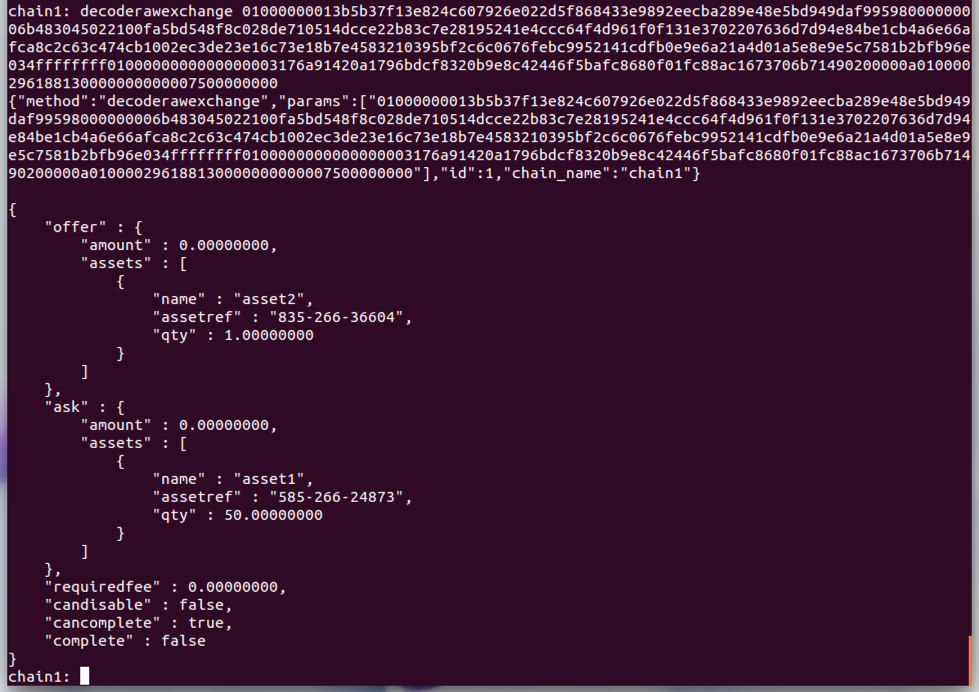 The output will show you exactly what is represented by this exchange offer in the offer and ask sections. In addition, "cancomplete" should be "true" meaning that the second server has the assets required to complete the exchange.