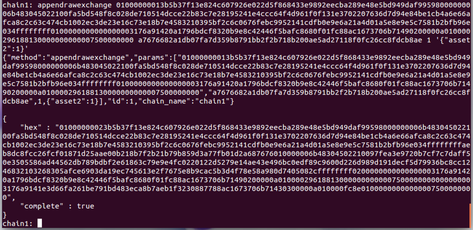 appendrawexchange [paste-hex-blob] a7676682a1db07fa7d359b8791bb2f2b718b200ae5ad27118f0fc26cc8fdcb8ae 1 '{"asset2":1}'