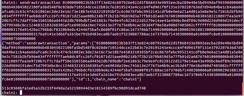 This final hex blob is a raw transaction representing the completed exchange. On your Second Server, execute this command to send the transaction to the network: