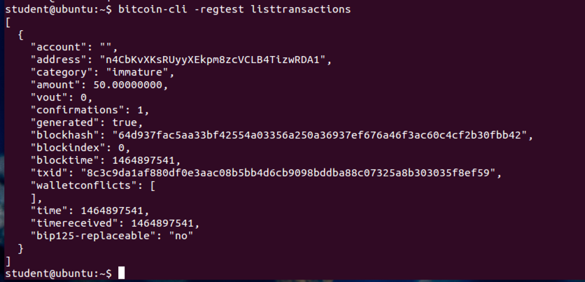 bitcoin-cli -regtest listtransactions