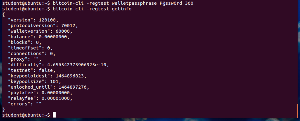bitcoin-cli -regtest walletpassphrase P@ssw0rd 360